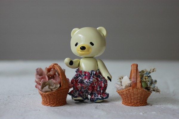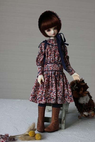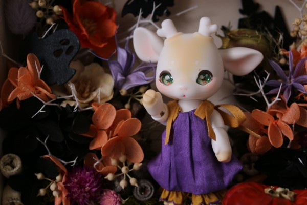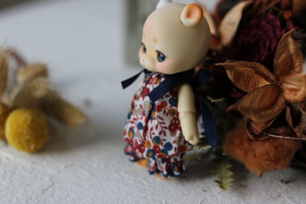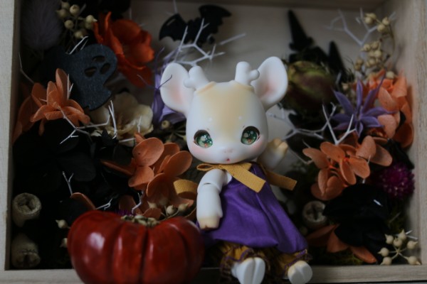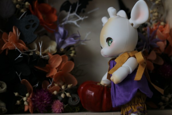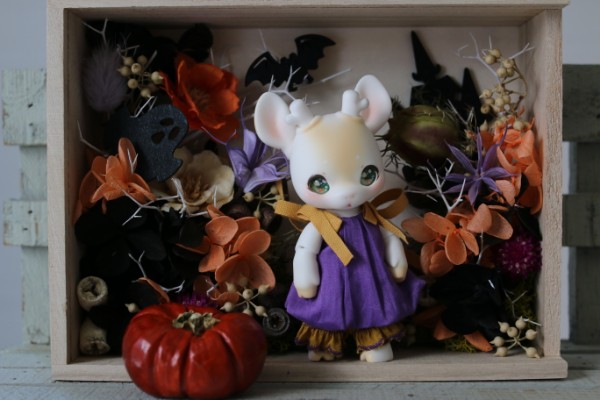 ココクムちゃんサイズのバルーンワンピース、かぼちゃパンツ、ハロウィンのセットアップ、フラワーアレンジメントがあります。